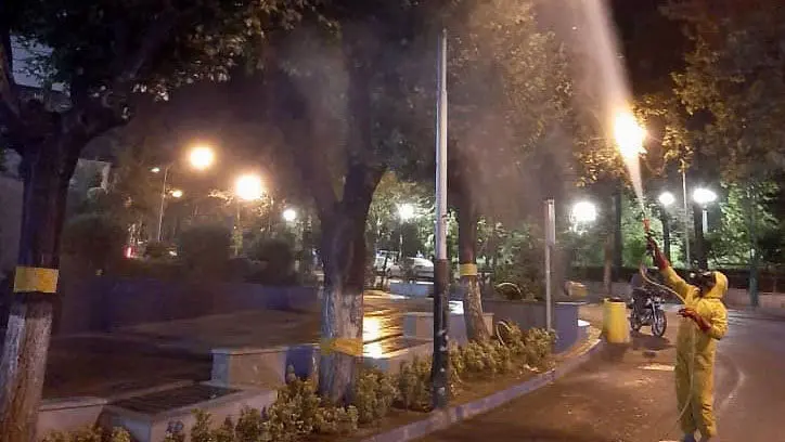 عملیات آبشویی درختان در عرصه های فضای سبز منطقه یک به منظور کنترل عوامل خسارت زا و آلاینده های زیست محیطی درحال انجام ا…